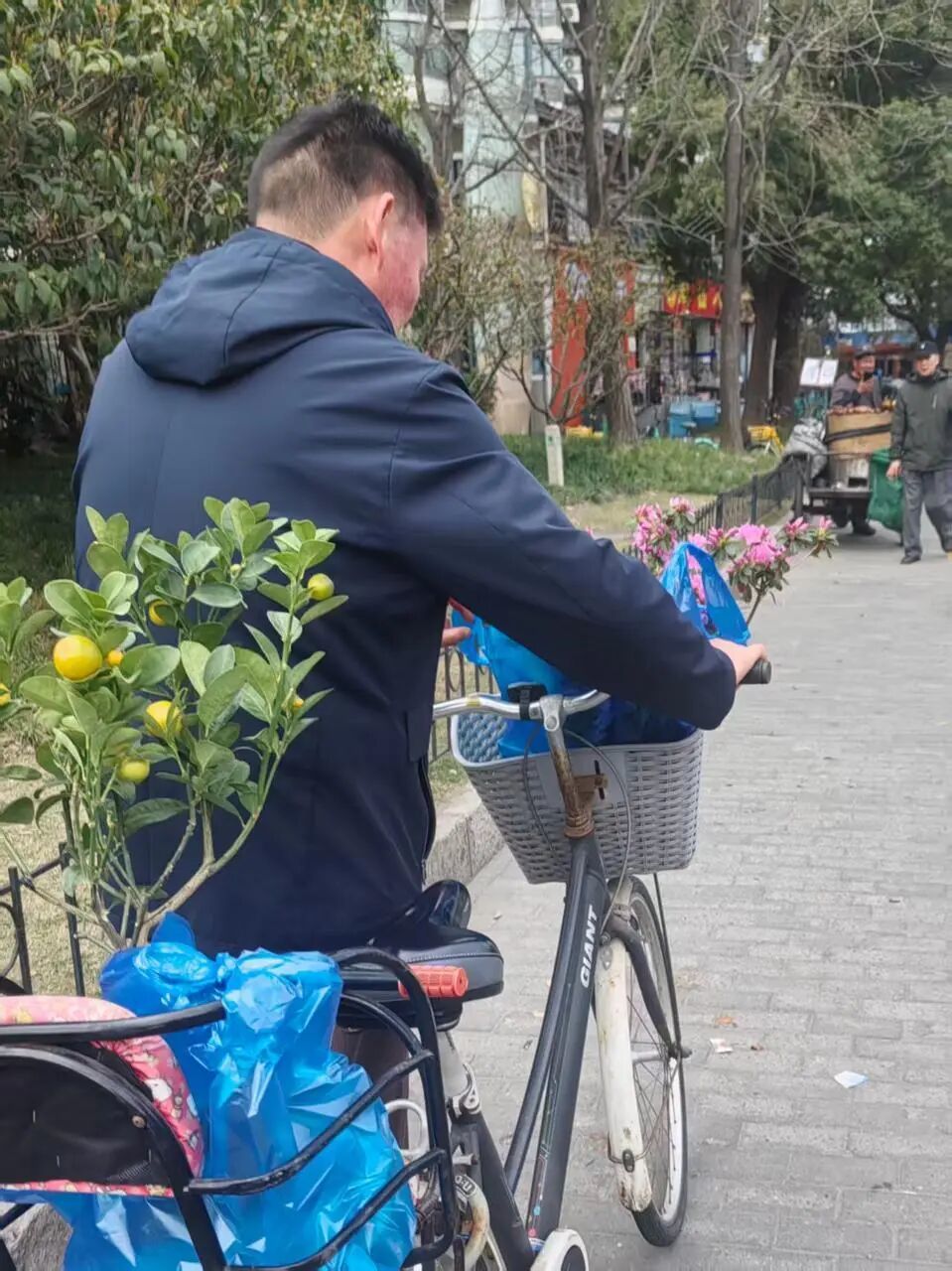 岚灵花鸟市场门口,用自行车带着盆栽回家的爷叔。(图/程艺丹 摄)