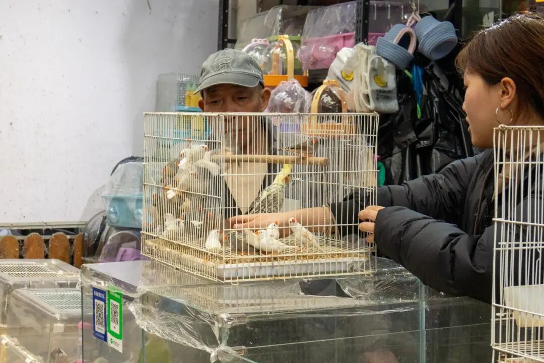 宠物店老板在帮顾客抓珍珠鸟。(图/程艺丹 摄)