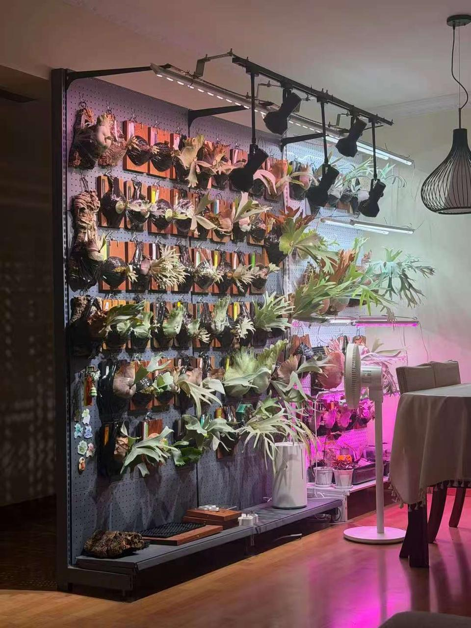 住在岚灵附近的王先生是热带植物迷。为了照顾几十棵鹿角蕨、几十盆花烛和秋海棠,他买了洞洞板、补光灯、加湿器,打造了一整面热植墙。“偶然刷到鹿角蕨这种植物,在淘宝买了第一棵,之后越买越多。”在岚灵可选择的热植不多,王先生大多在网上购买,并加入热植爱好者交流群。
