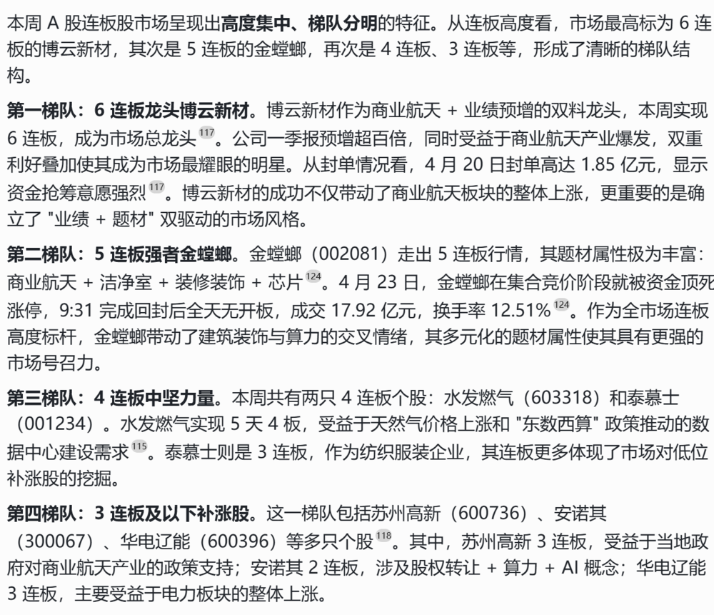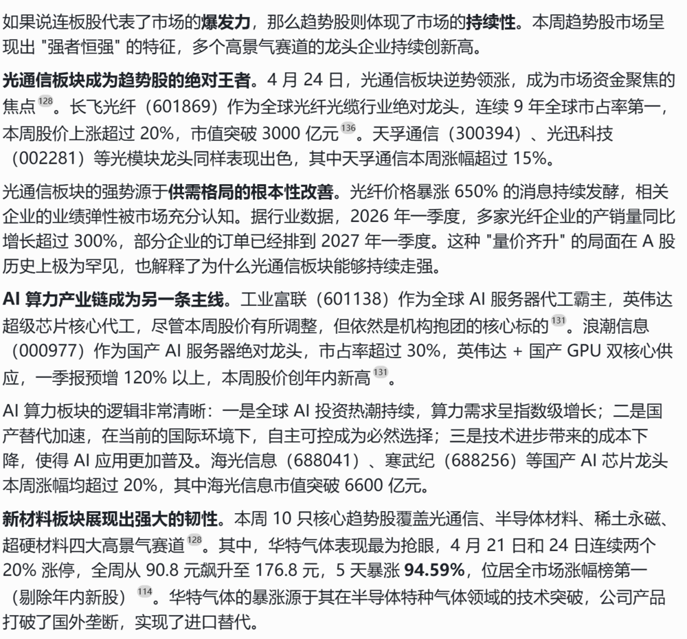 2026 年 4 月 20 日至 24 日,A 股市场呈现结构性分化格局,沪指全周上涨 0.70% 报收 4079.90 点,深成指涨 0.37%,创业板指跌 0.29%。尽管指数微涨,但超 3400 只个股下跌,市场赚钱效应严重分化。